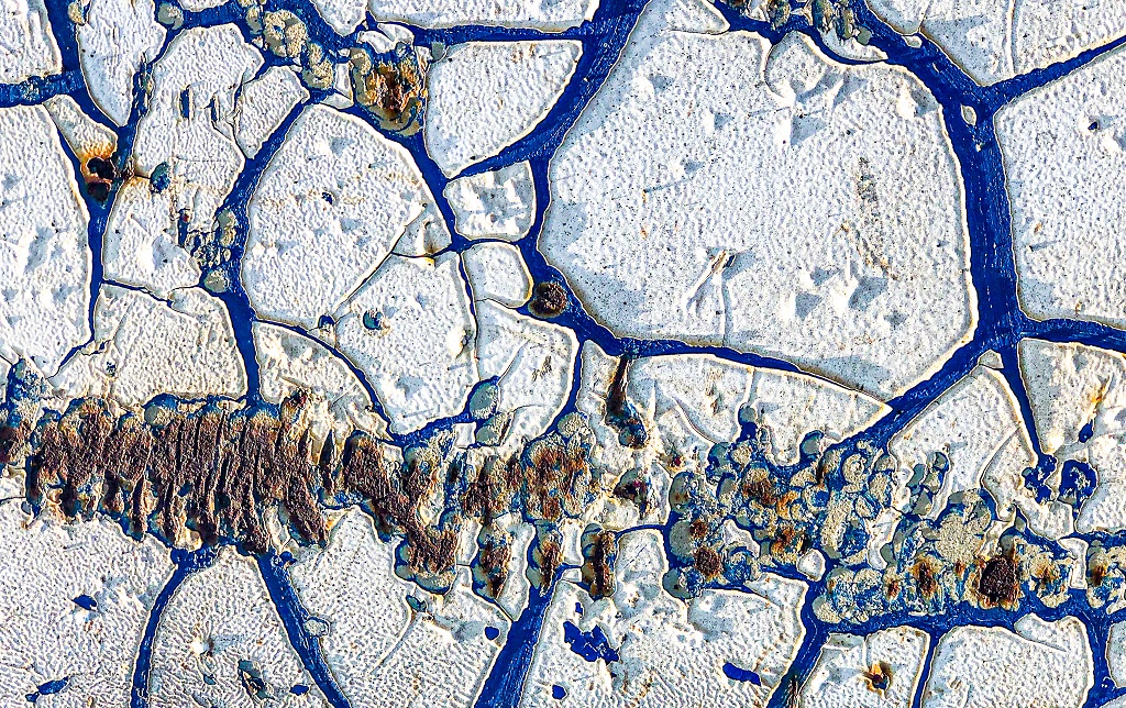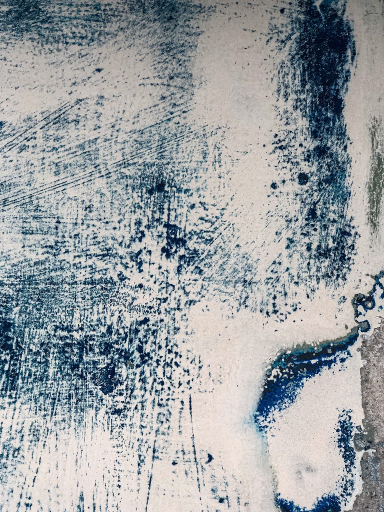 La surface est traversée de traces, de frottement et de couches successives, comme une mémoire inscrite dans la peinture.