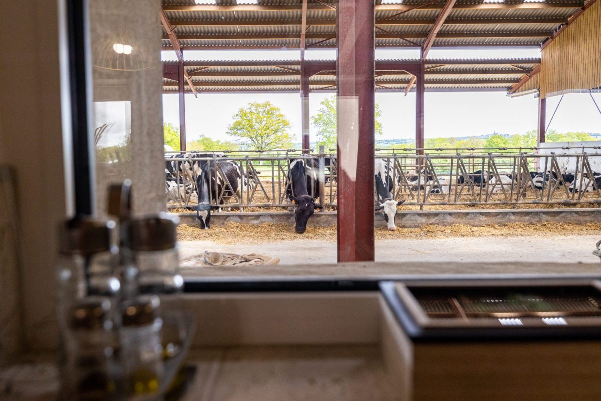 Le gite a, ce que nous appelons, une vue vache. Une des fenêtres donne sur les bâtiments de l’exploitation et les champs à l’horizon.