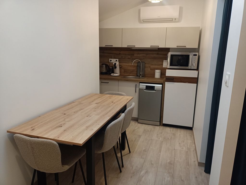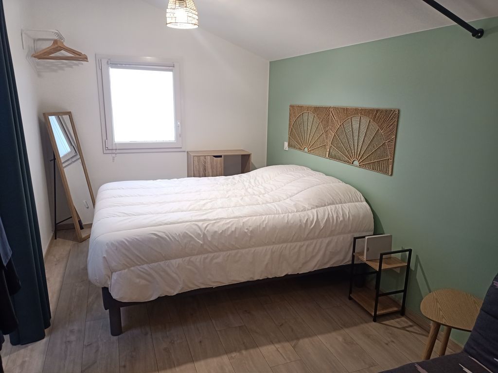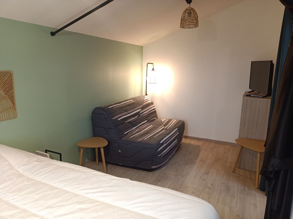 Le studio comprend une grande chambre avec lit 140/190 et salon (clic clac et TV) , une autre avec un lit double 140/190 . L'espace comprend une cuisine équipée (plaque induction, four combiné micro-ondes, frigo, lave vaisselle, cafetière, bouilloire, grille pain ..