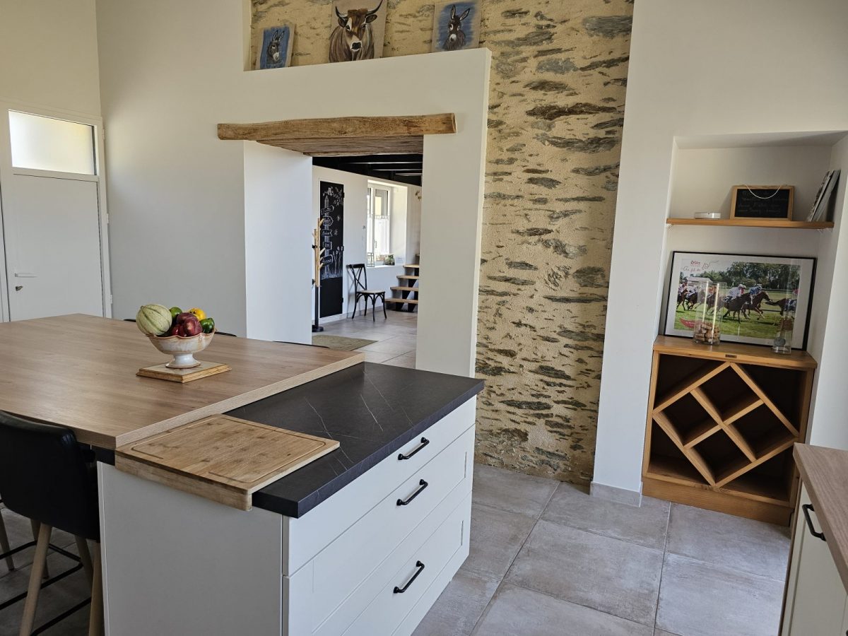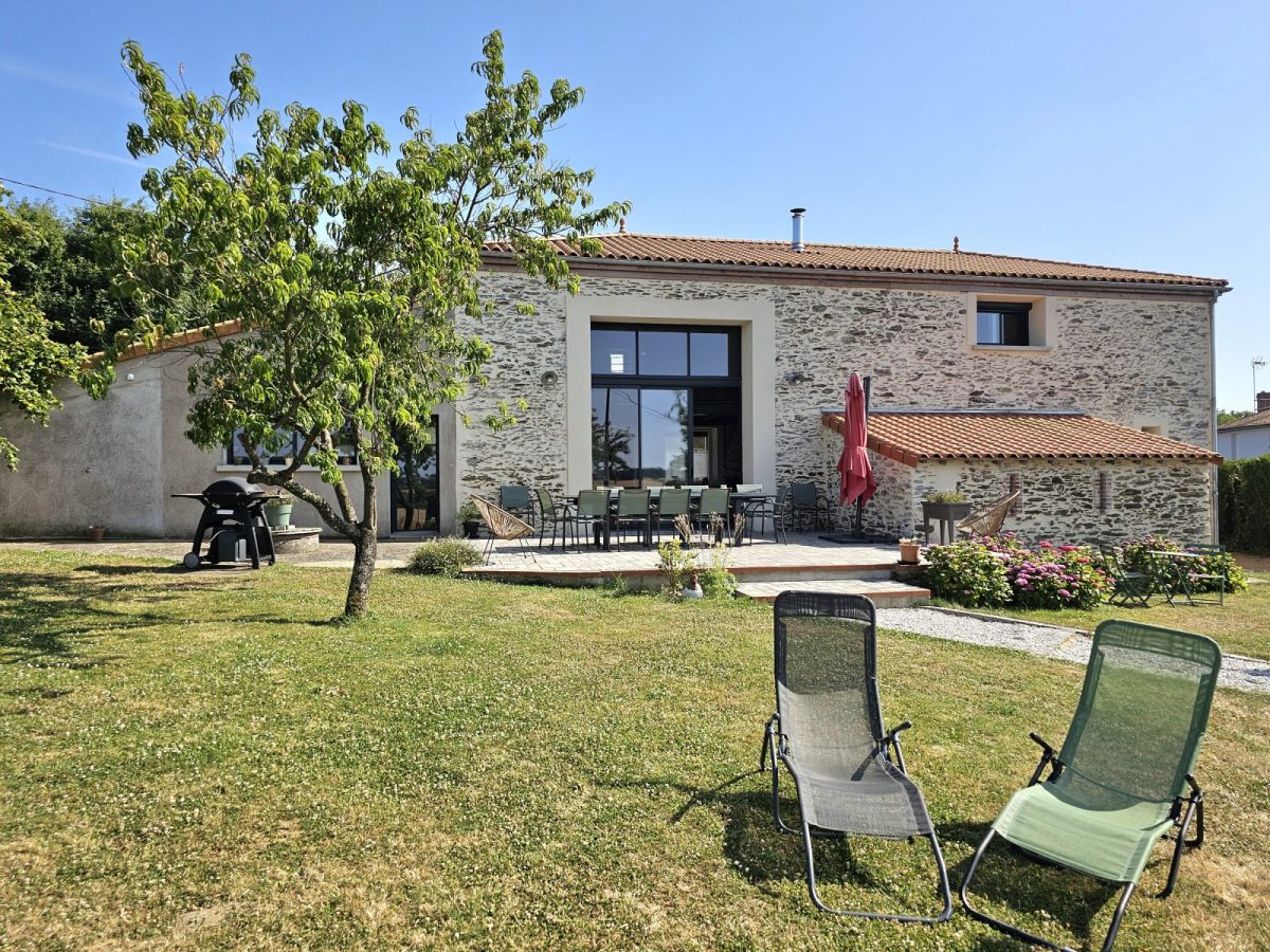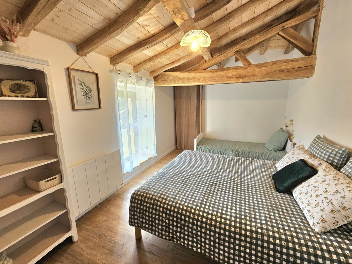 Avec sa vue sur la campagne et la forêt, sa belle charpente en bois, ses murs en pierre apparente, son poêle, son filet suspendu, sa grande cuisine équipée, son salon reposant et ses quatre chambres avec salles de bain attenantes, ce logement de charme vous fera vous sentir comme à la maison...