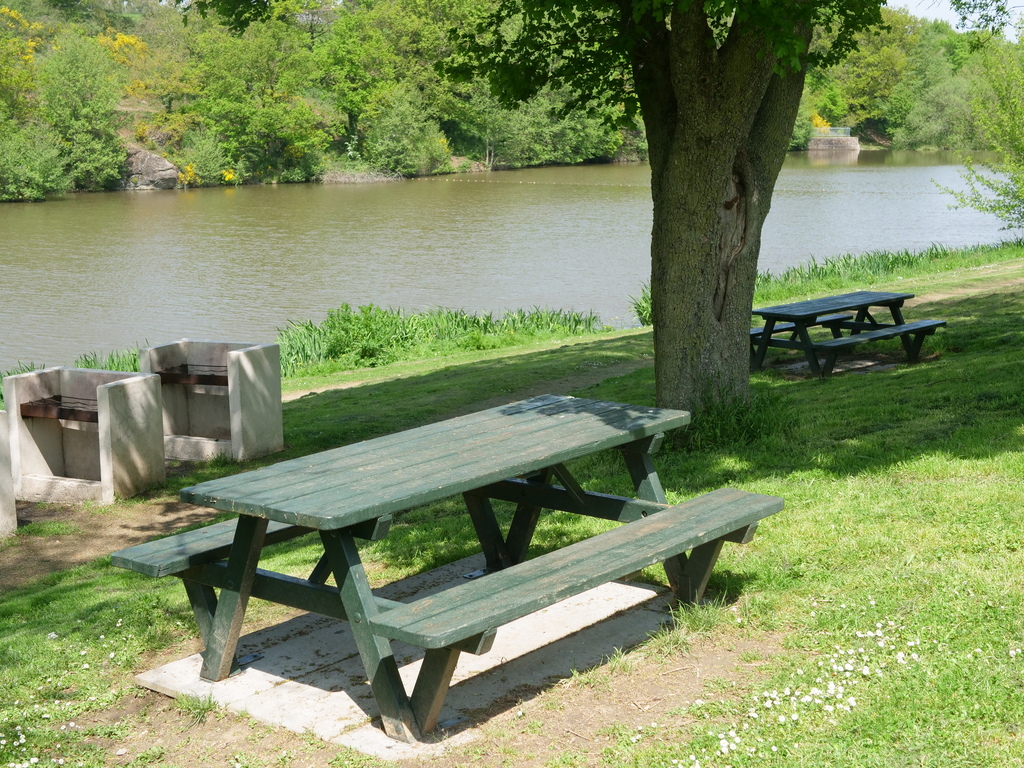 Des tables de pique-nique sont installées à divers endroits près du plan d'eau.